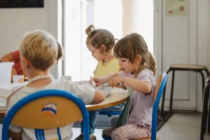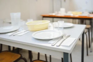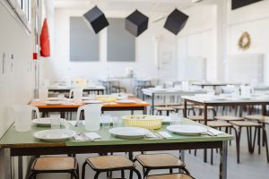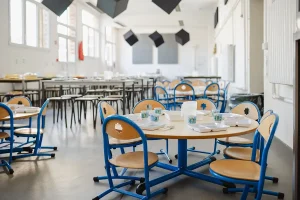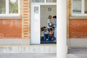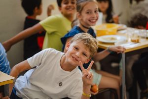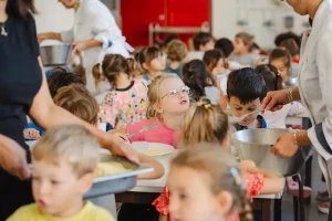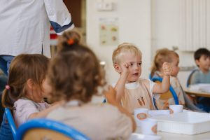 Les repas sont pris sous la surveillance de l’équipe éducative et du personnel de cantine qui passent à table pour servir les enfants.