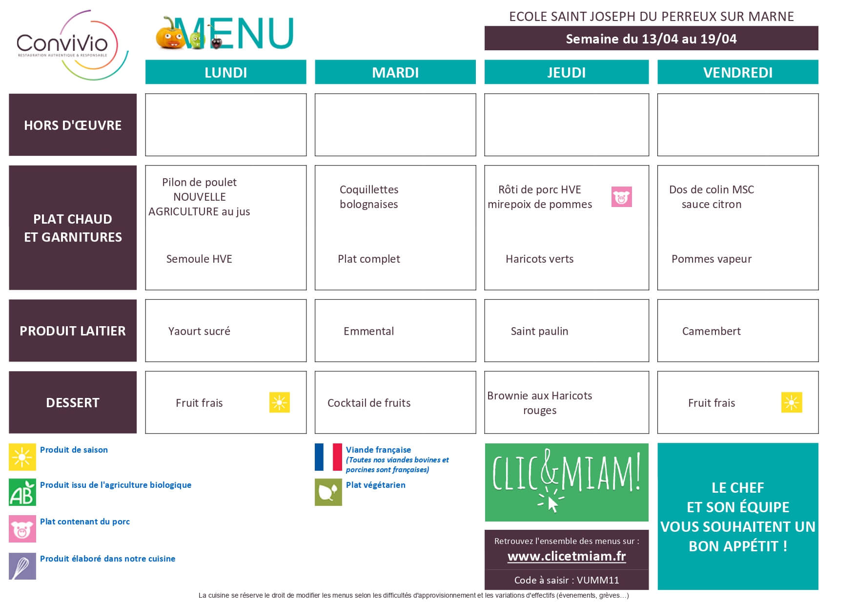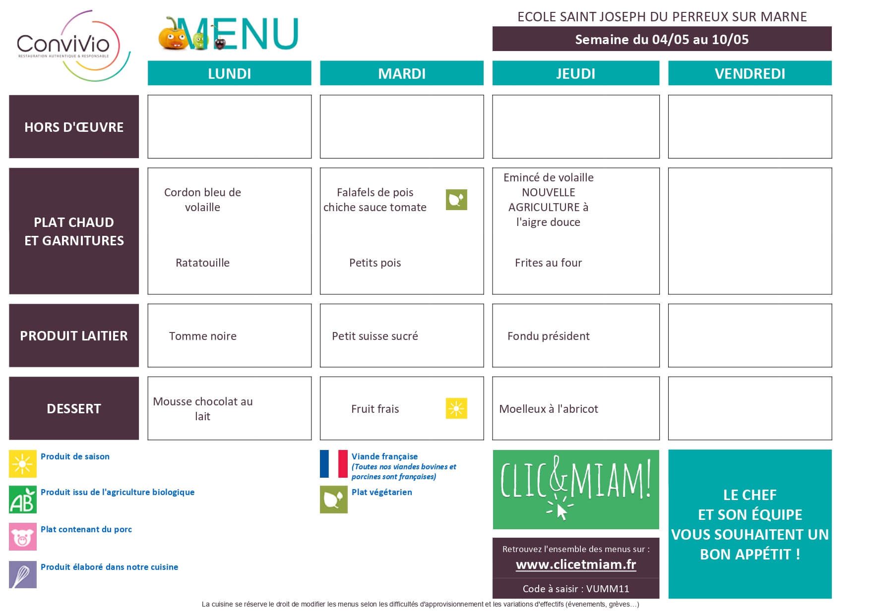 Les menus, élaborés avec soin, visent à proposer une alimentation équilibrée et variée tout au long de l’année scolaire.